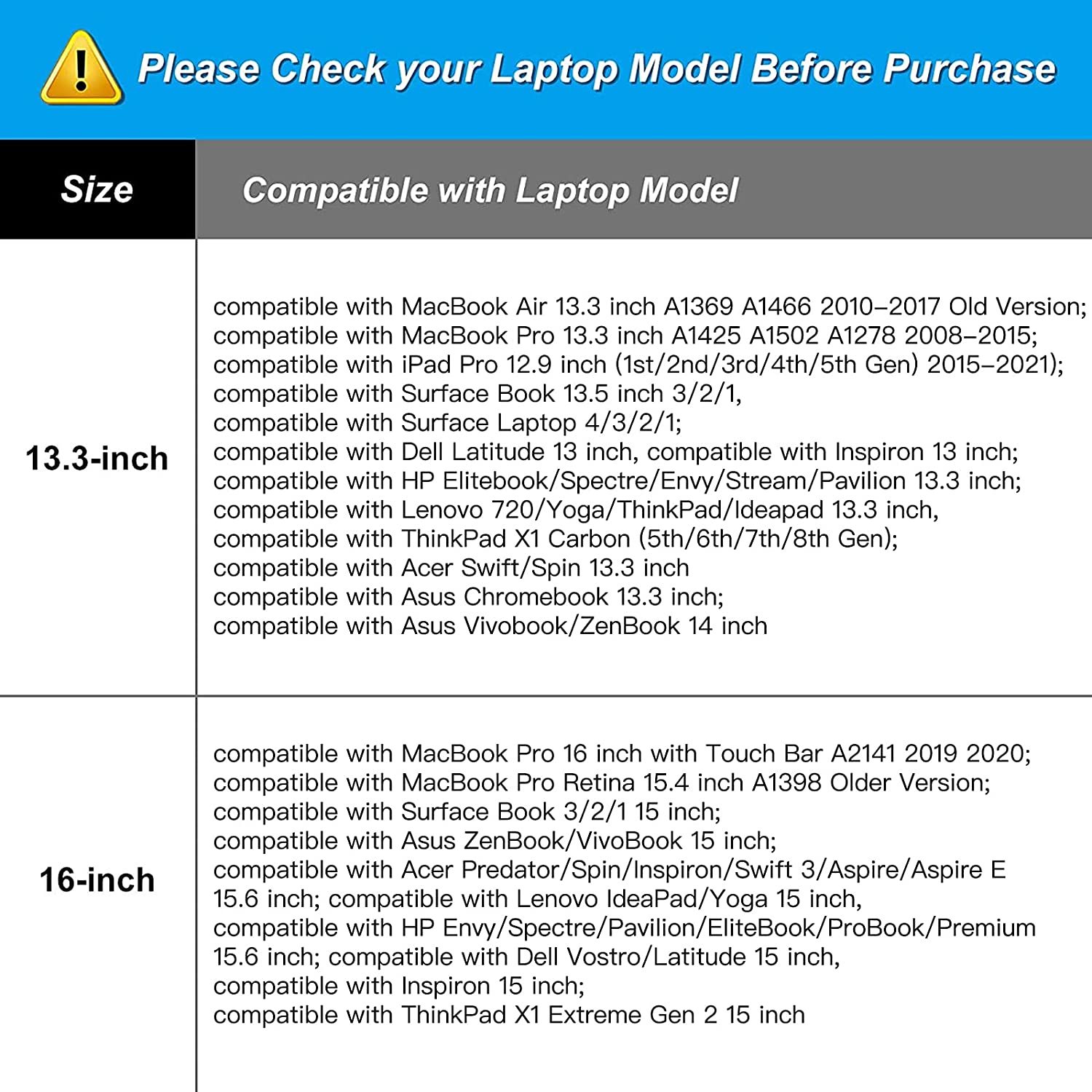 • Compatible with MacBook Pro 16 inch 2022 2021 A2485 M1 Pro/M1 Max with Touch ID, compatible with MacBook Pro 16 A2141 2019 2020, compatible with MacBook Pro Retina 15.4 A1398; Compatible with Surface Book 3/2/1 15; Compatible with Asus ZenBook/VivoBook 15; Compatible with Acer Swift 3 14 / Swift 5 15.6, compatible with Acer Aspire 3/5/7 15.6; Compatible with HP ProBook/Spectre x360/Envy x360 15.6; compatible with HP Omen/Pavilion x360 15.6; Compatible with Dell XPS/Precision/Vostro/Latitude 15.