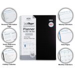 The See It Bigger planner covers 15 months, featuring monthly and weekly dated pages for easy planning. Individual monthly tabs allow for quick access to separate monthly calendars that open flat in side-by-side pages. A defined space along the right margin provides room for notes and tasks. Dated weekly view pages so each week may be viewed in its entirety with ample space to jot down information for each day. Monthly view pages show Yearly Reference Calendars and Holiday Listings making future planning simple. A dedicated Note, Contact, and Password Record Pages put all information at your fingertips.